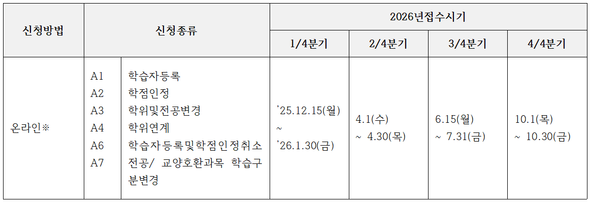 2026년도 학점은행제 학습자 등록 및 각종 신청접수 계획을 아래와 같이 공고합니다.